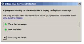 All Synthetic Selenium tests run on the Riverbed test engine service in the Local System user account of the test engine host. Every time a Selenium test runs (whether scheduled or on demand), the Interactive Services Detection pop-up appears. This pop-up notifies the logged-in user that the local system user’s desktop can be opened for viewing.