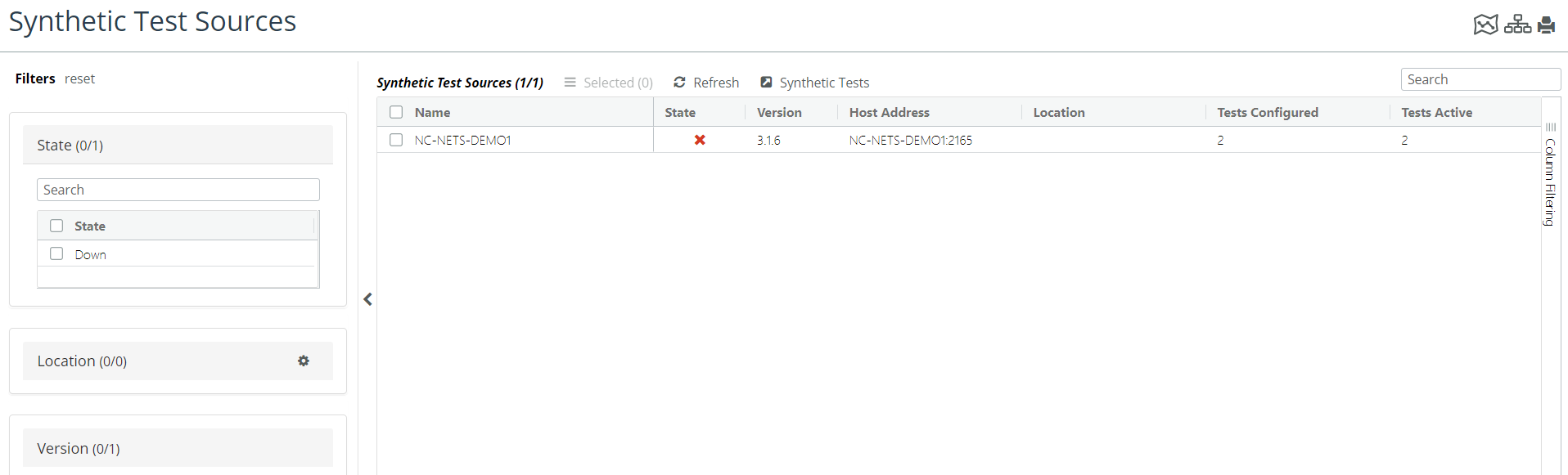 3. Click Synthetic Test Sources at the top of the page. A list of the installed test engines and their status appears, as shown in the following screen.