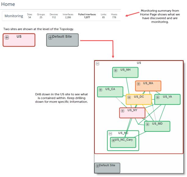 The Topology Viewer has a limit of 1,000 visible devices. If you try to display a network that has more than 1,000 devices, you will see an error. The solution is to use groupings to limit the devices displayed in a view to fewer than 1,000. In the example below, notice that there are only two sites at the top level, but 70 discovered devices and 2,995 interfaces. The view is clean and easy to read, but you have not lost any information. You simply drill down to more specific groups of devices and interfaces to find the information you want to see. Sites can be hierarchical. Notice in the example that there is a US and Default Site. Each site has more sites within it.
