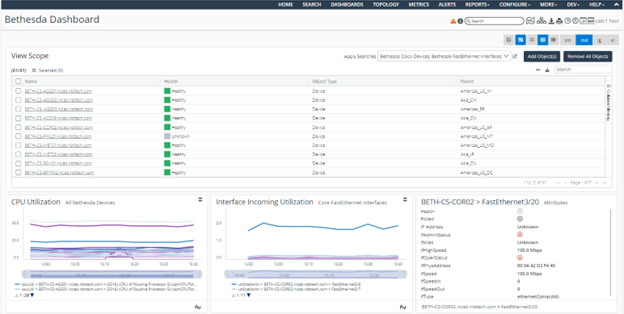 Dashboards gives you the flexibility to create more complex views whose scope and panel content span multiple objects and object type. Previously, NetIM curated views supported a single object who served as the view’s scope. Dashboards allows you to apply many scope objects (of various types) to the page. The panels applied to the view will use the scope objects that apply to them based on their configuration.