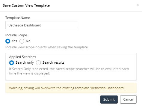 Dashboards supports optionally saving the applied scope when saving the view template. The saved scope objects will be loaded and applied to the view whenever that view template is displayed. When saving the template, you have the option of saving the current set of scope objects, or saving the searches expressions that resulted in those objects. Saving the searches will result in dynamic scope content due to the searches being reevaluated each time the view is displayed.