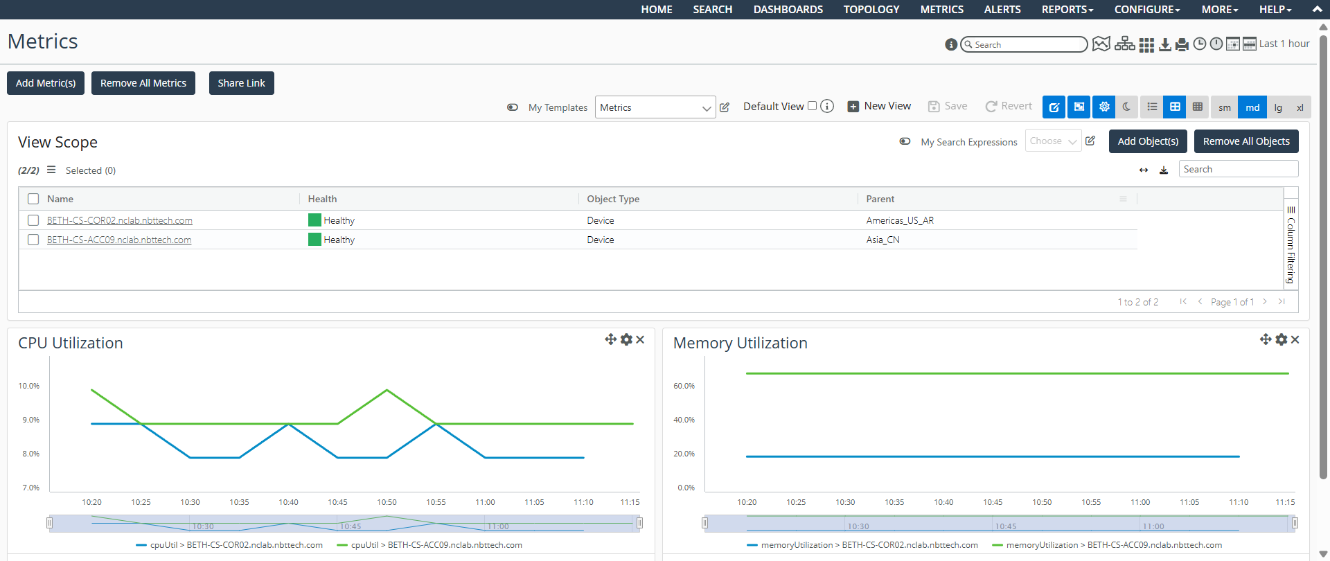 To launch the Metrics page, choose Metrics on the menu bar. A selection of metrics are immediately available in the Metrics page.