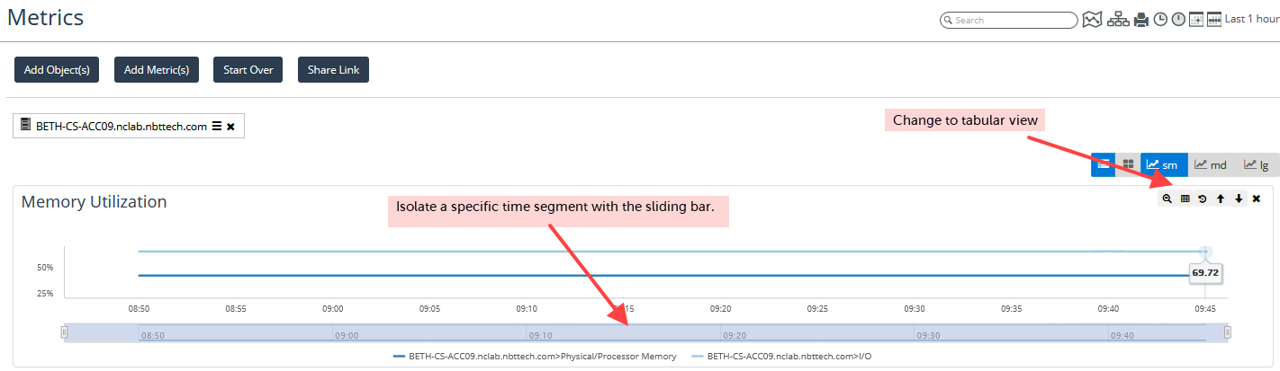 From the main screen, you can select objects in a panel and click Show Metrics to see the graphs of those metrics for the given object(s).