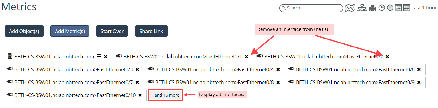 • To remove a single interface and its metrics from the navigator, click the X on the icon.