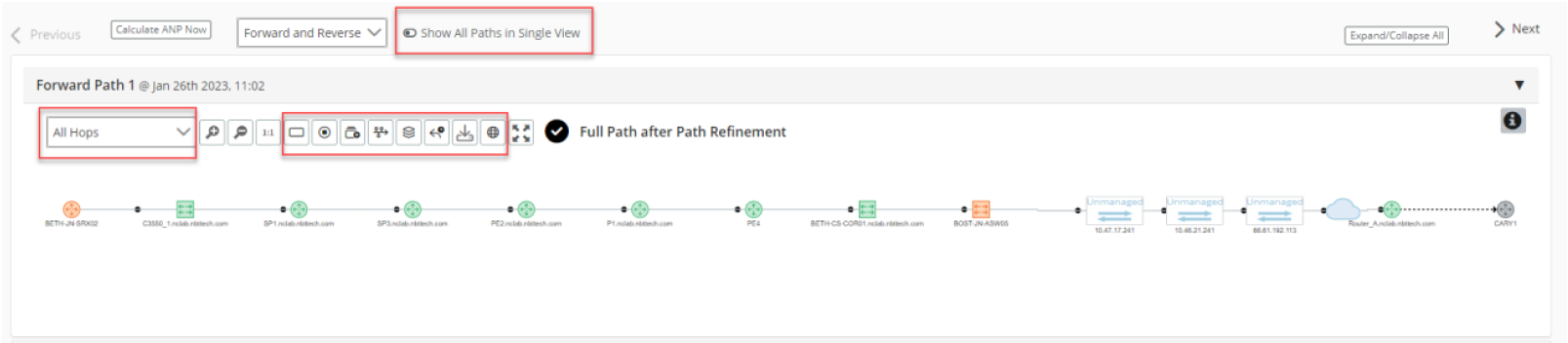 After the AppNetwork Path is calculated, a path visualization appears. Each hop along the path is detailed, including the ingress and egress ports, as shown in the following screen.