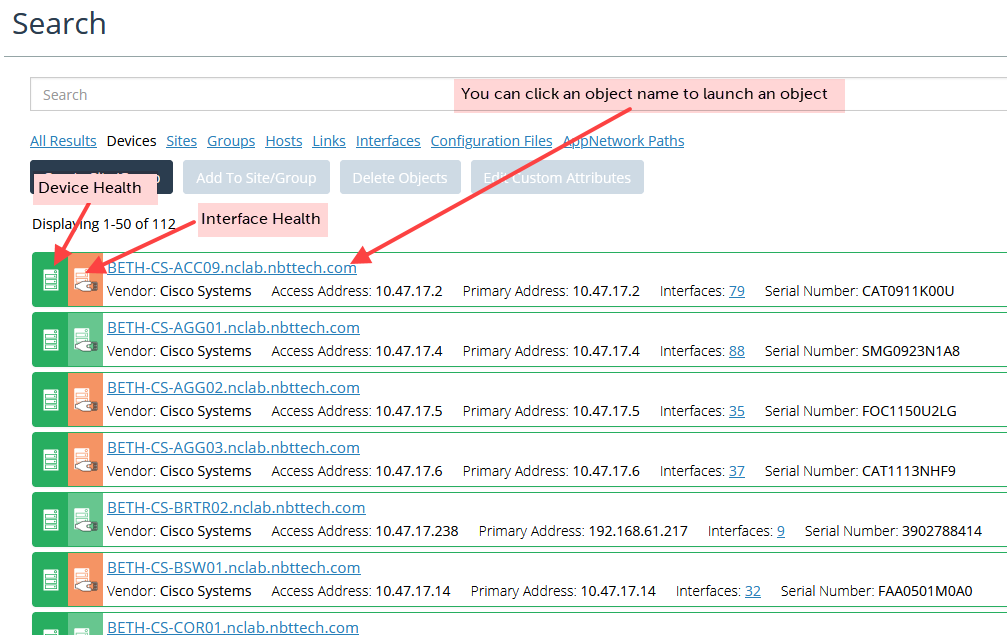 • You can change the area of focus by choosing a different type of results. For example, if you change the focus from Devices to Interfaces, you can jump to the interface results that match our search string.