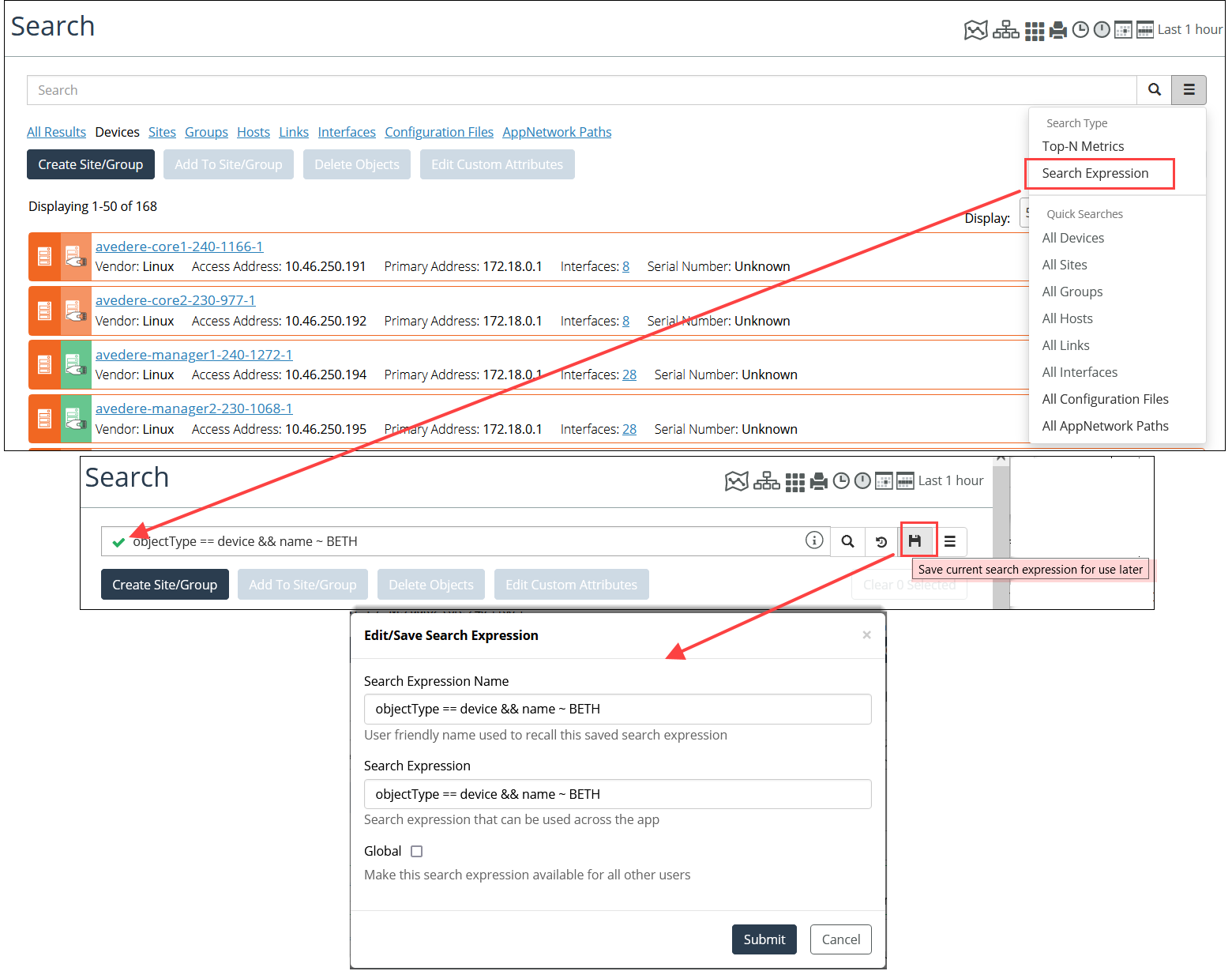 Additionally, you can save a new search expression to the Search Expressions page, as shown in the following screens.