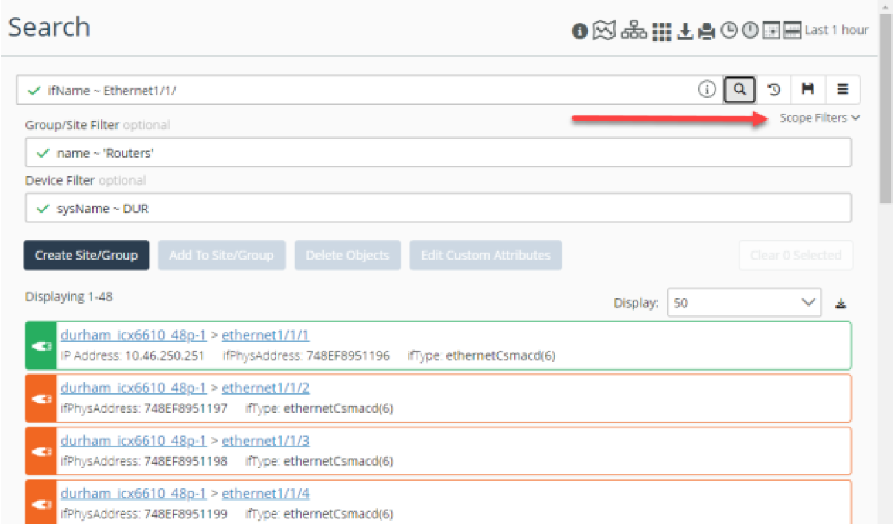 You can now better control your search for objects by enabling filters for sites, groups, or devices. This scope filtering is particularly useful for searching for interfaces.