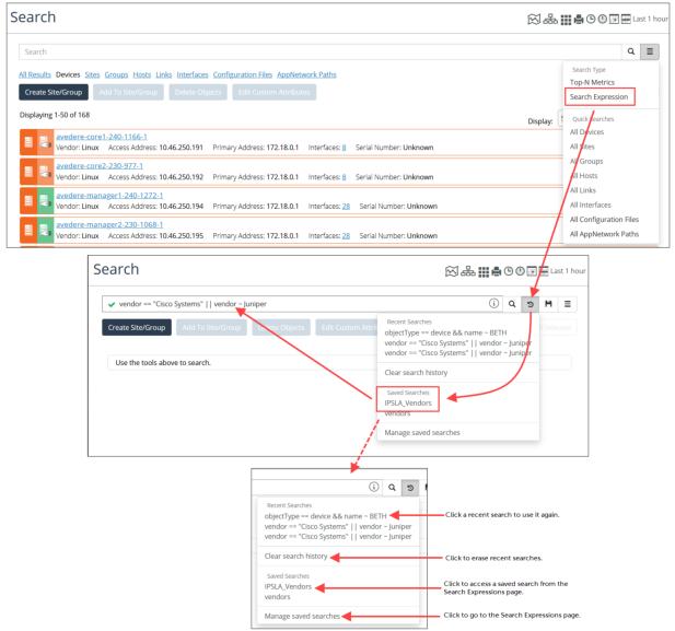 When using search expressions, the Search page not only allows you to create a new expression, but also to select a search expression from a list of previous searches, access a saved search, or manage saved search expressions by going to the Search Expressions page, as shown in the following screens.