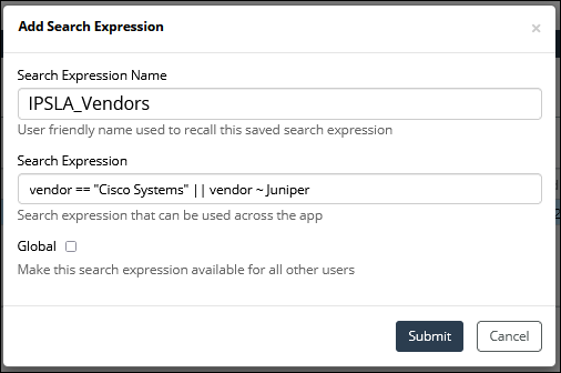 NetIM supports the ability to create persistent search expressions that can be set to personal use (default) or global by the user who created them. The search expressions can be created on the Search Expressions page or saved to the Search Expressions page from the Search page and from the search section when creating a Performance Summary report on the Reports page.