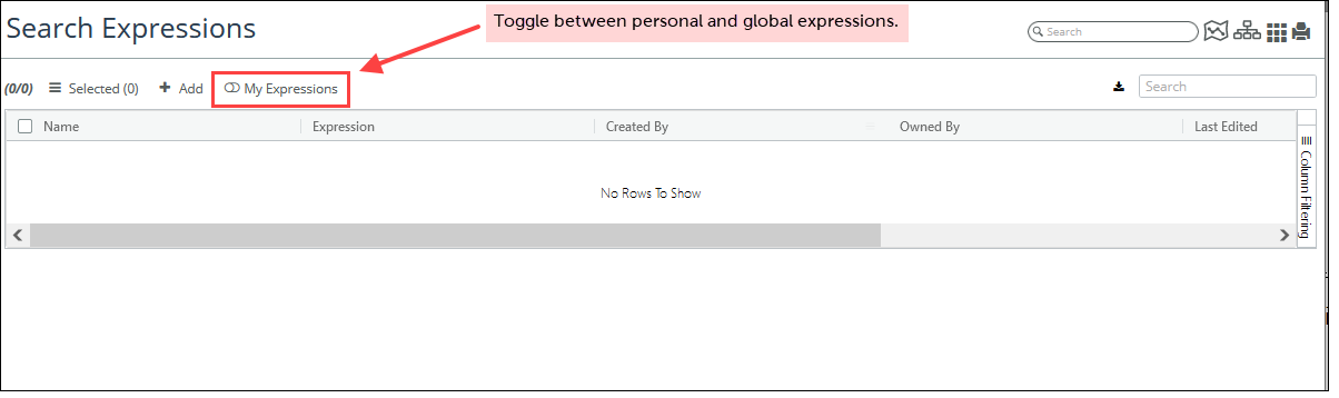 The Search Expressions page contains a list of all personal and global search expressions. You can also edit or delete the search expressions that you created.