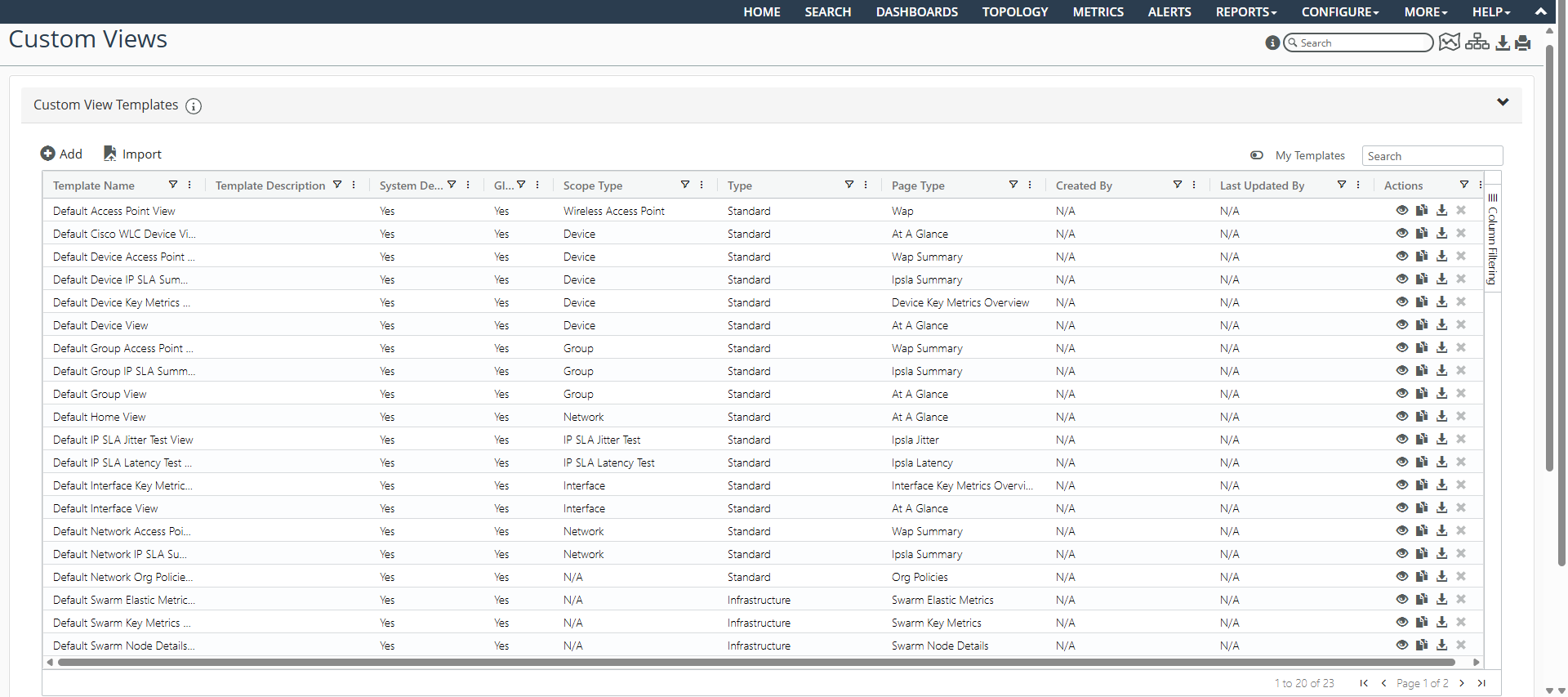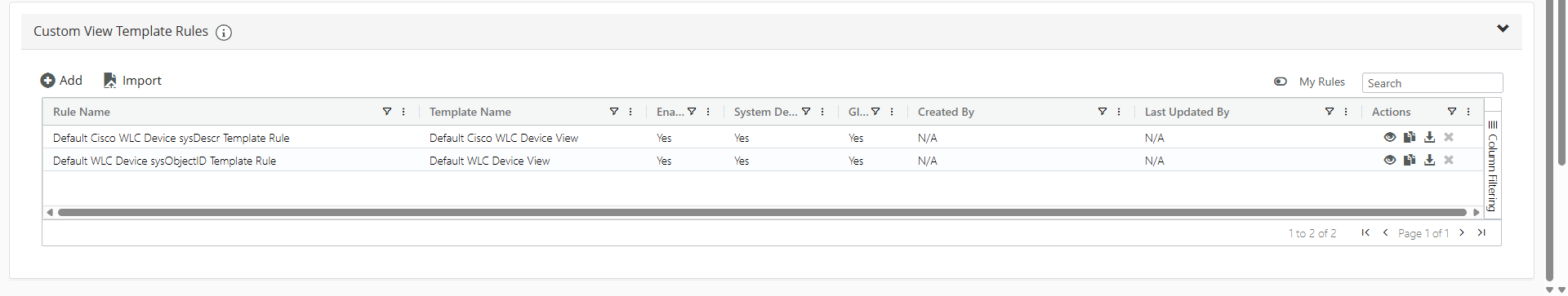The Custom Views page allows you to add (+Add icon), delete (X icon), import, and modify (pencil icon) Custom View Templates and Custom View Template Rules, as shown in the following screens.