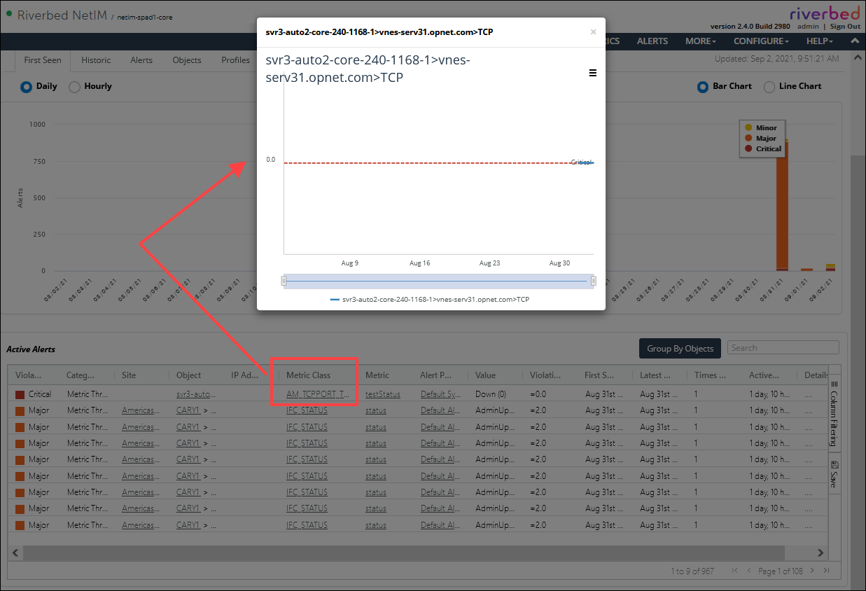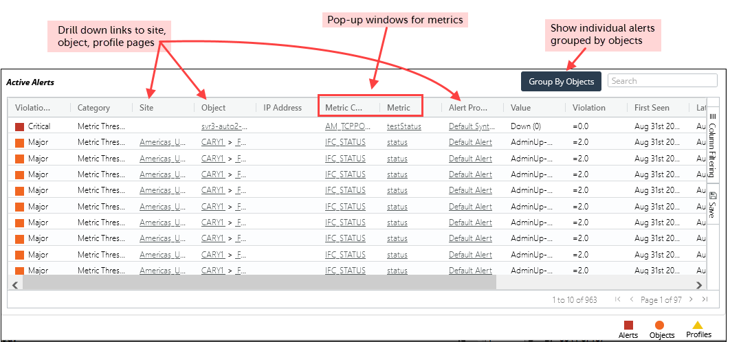 – In the Show Individual Alerts view, the Site, Object, and Alert Profile columns provide links that take you to the associated pages for those alert, and the Metric Class and Metric columns provide links that display a pop-up with a quick view of the metric over time, as shown in the following screen.
