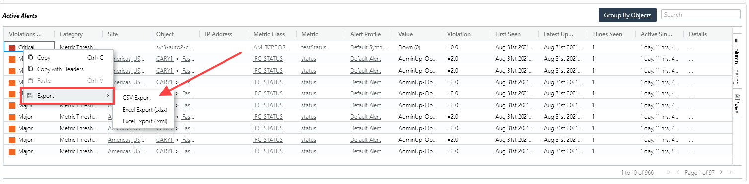 – You can copy and export a selected alert by right-clicking it and using the pop-up menu, as shown in the following screen.