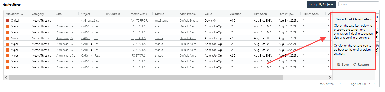 – Once you have selected the columns you want to display, you can save these settings by clicking the Save icon in the far right of the Active Alerts frame, as shown in the following screen.