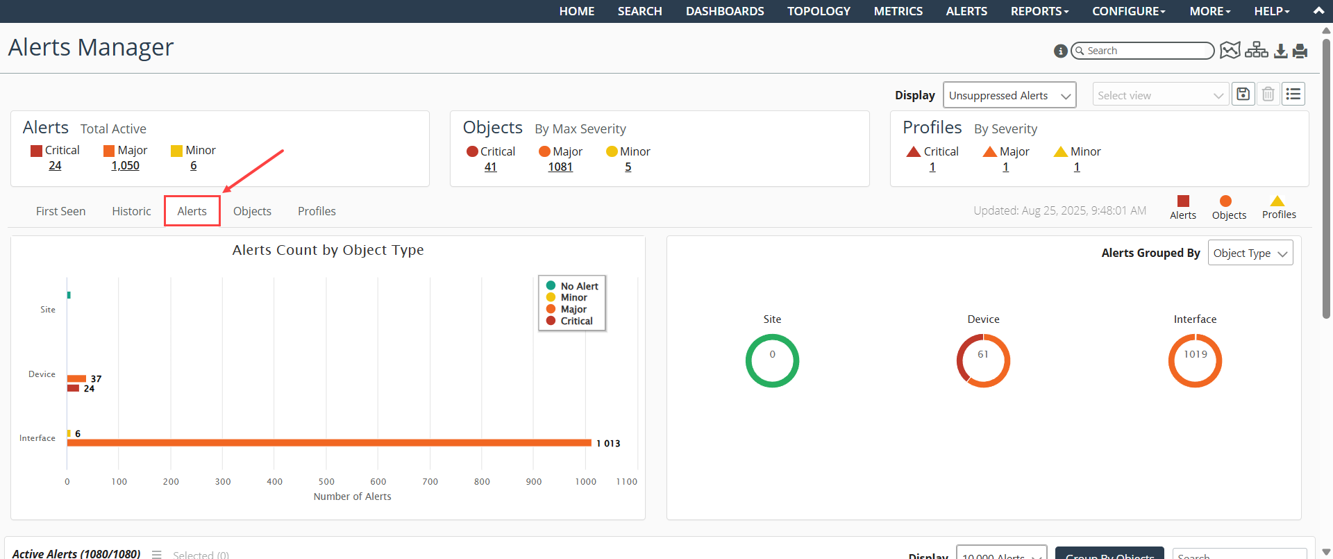 Active Alerts Table with only those active alerts to focus your troubleshooting. You can also view Active Alerts Counts historically over time and view when Alert threshold violations were first seen or triggered.