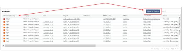 – The display can be toggled between Show Individual Alerts (default) and Group by Objects, as shown in the following screen.