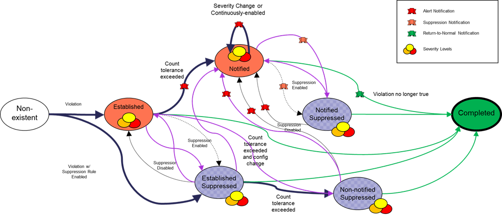 • Non-notified Suppressed: Notification is configured for the alert’s profile and the alert has been active for equal to or greater than the profile’s Threshold Violation Tolerance, but the alert has been suppressed since its creation.