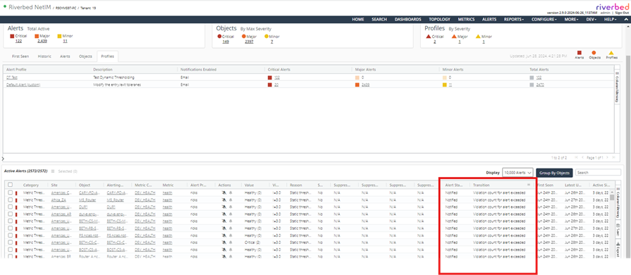 • Notified: Notification is configured for the alert’s profile and the alert has been active for equal to or greater than the profile’s Threshold Violation Tolerance.