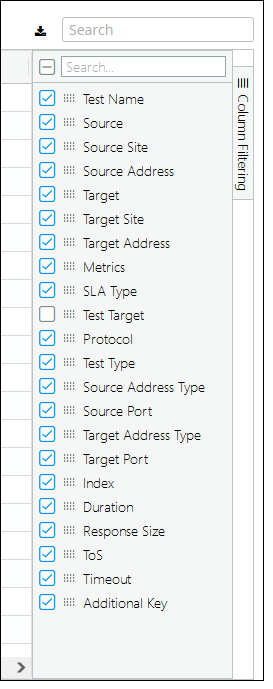 The IP SLA Details frame consists of several columns of salient IP SLA test information that give you the ability to search, sort, and filter the table of tests. You can also drill down to the specific test, source/target site, or source/target device of the test, as shown in the following screen.