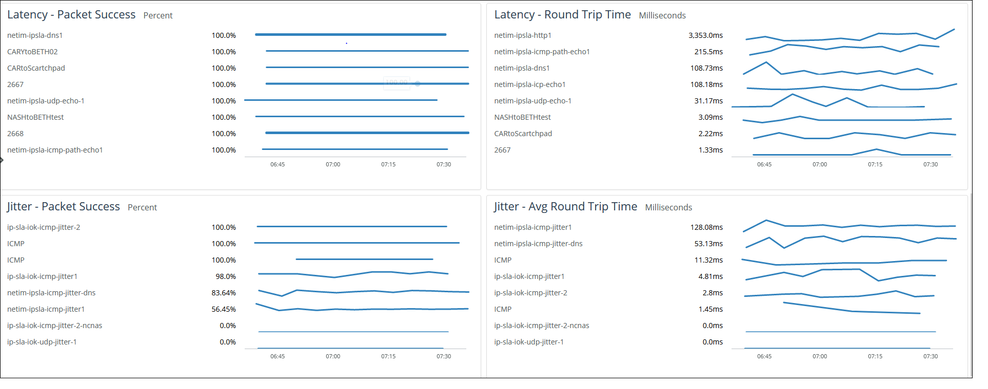 The IP SLA Top-N Reports frame consists of several salient IP SLA test Top-N reports for metrics associated with the IP SLA tests, as shown in the following screen.