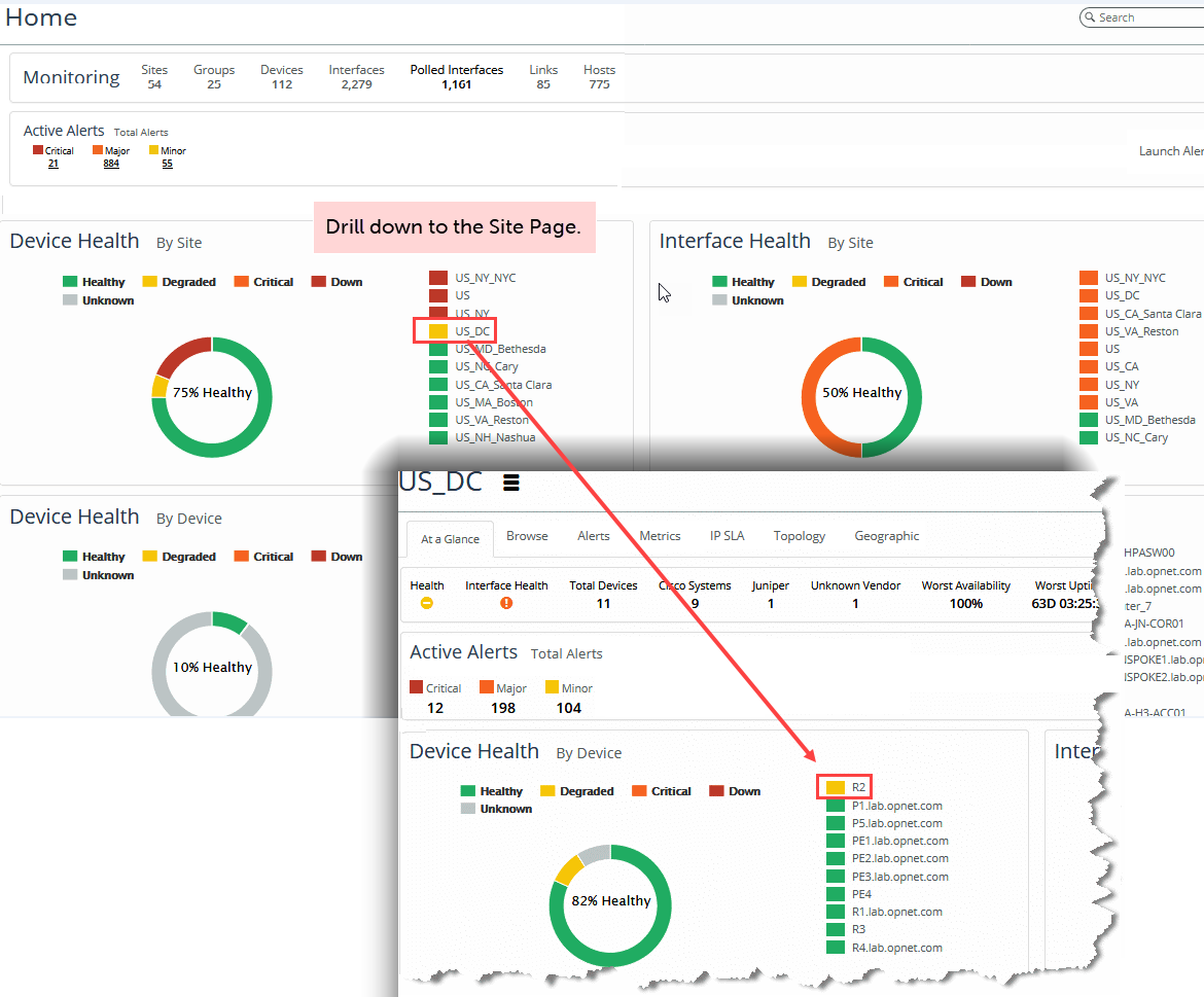 The following screen shows an example of a site in a degraded state (yellow coloring). Begin troubleshooting by drilling down to find out more information about the objects in this site. In this example, you click the site link for US_DC on the Home page, which takes you to the US_DC site page, where you see that router R2 is in a degraded state. The site inherits its health status from this degraded device.