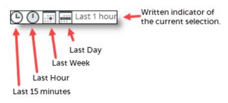 Many of the screens you encounter in NetIM have a time window. The time window is a set of controls, shown in the figure below, that lets you choose the time window of interest to you. Changing the time window widens or narrows the amount of information you see on the given page. Click an icon in the time window controller to change your selection.