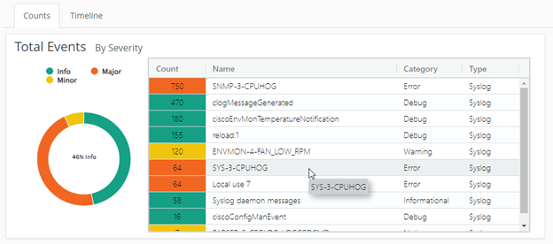 Individual rows in the Total Events By Severity can be selected to filter out the relevant events in the events table.