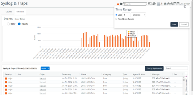 The Syslog & Traps view can be accessed under Configure > All Settings > Alert: Syslog & Traps, or More > Syslog & Traps. The view consists of two tabs: Counts and Timeline. Syslog & Traps is also available for each device that has the relevant events.