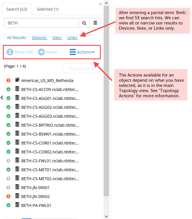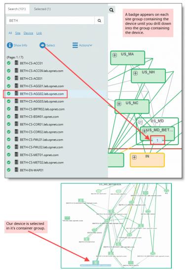 When you select an object in your search results, you may choose Show Info, which works the same way as the Show Info button in the main Topology view, or you may choose Select. In the example below, you have selected a device in our search results and pressed Select. Notice that there is a badge on the site group US_MD, which indicates that our selection is contained within that site group. Next, you drill down until you find the device in a site group. The device is selected for you in the topology.